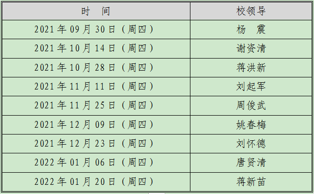 为进一步拓宽校领导与师生的联系渠道,解决师生反映的重点问题、突出问题,根据《William威廉官网校领导接待日制度》(校行发〔2017〕9号),结合学校新冠肺炎疫情防控要求,现将William威廉官网2021年下学期校领导接待日工作安排如下:
