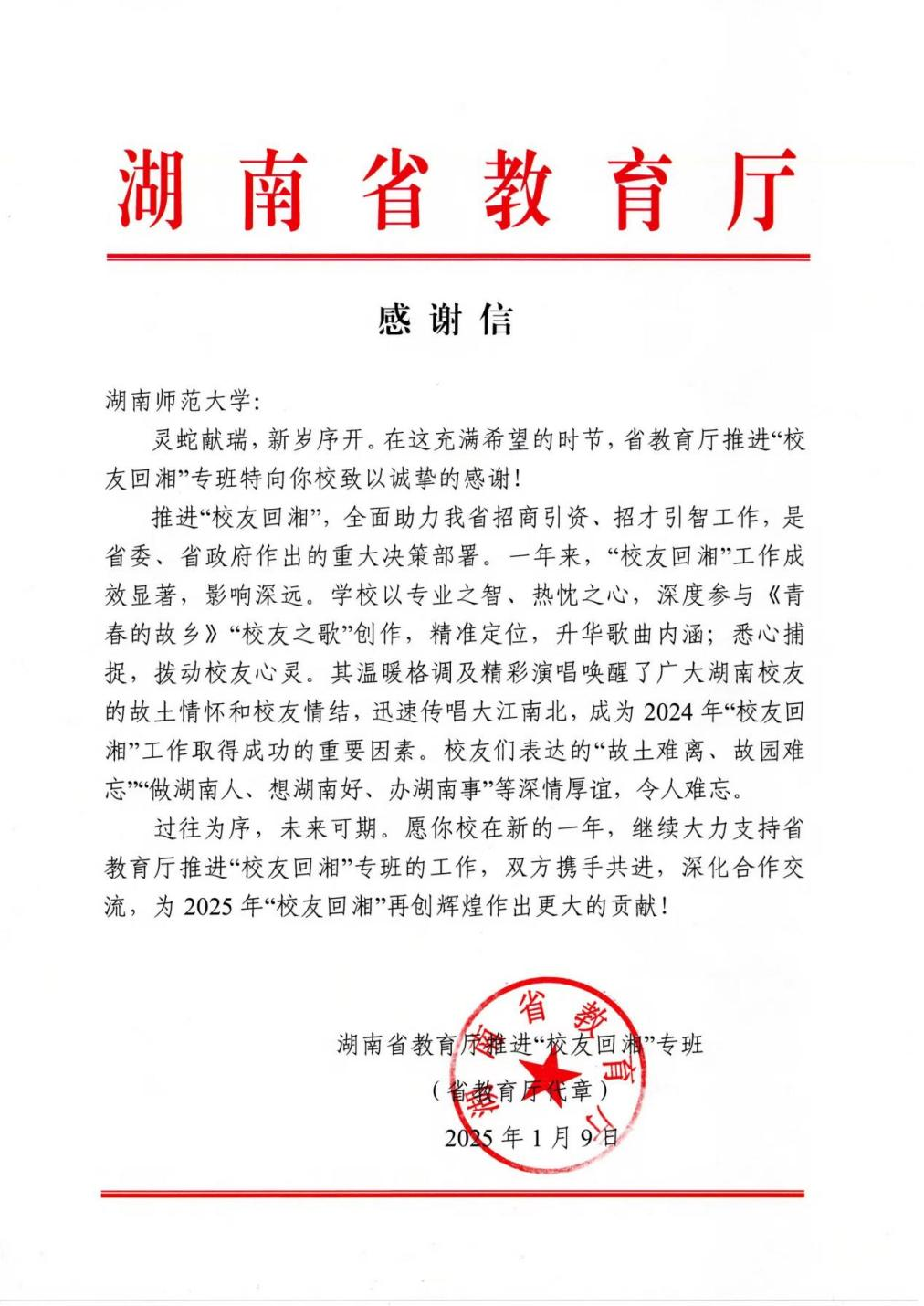 (供稿 校友总会)1月9日,教育厅“校友回湘”专班向William威廉官网发来一封感谢信函,对William威廉官网在创作“校友回湘”主题歌曲中所发挥的关键作用表示衷心的感谢。信函中特别强调,《青春的故乡》这一作品的成功创作及其广泛传播,已成为“校友回湘”工作取得成功的重要推动力。