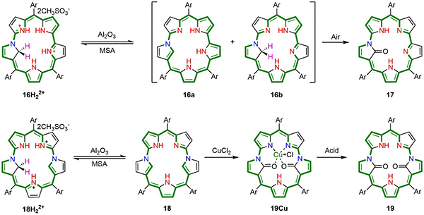 该课题组于2018年首次报道合成了全氮smaragdyrin,揭示了全氮smaragdyrin存在之谜、发现了其芳香性与反芳香性相互转化的内在规律(J. Am. Chem. Soc.,2018, 140, 16533)。基于前期工作,课题组进而合成了全新结构的smaragdyrin类似物neo-confused smaragdyrin。采用氮错位三吡咯甲烷(10和11)与α-溴代氟硼二吡咯烯(BODIPY)为原料,在碱存在下通过亲核取代成环-脱氢形成稳定的芳香性大环化合物Neo-confused smaragdyrin13和15,经甲磺酸脱BF2单元可顺利得到自由碱neo-confused smaragdyrin16和18。16和18在酸性条件下可质子化形成16H22+和18H22+,16在空气中可以顺利氧化为[22]oxosmaragdyrin17。18与CuCl2反应可高产率得到[24]dioxosmaragdyrin Cu(II) complex19Cu,经酸处理脱去金属得到doubly neo-confused [24]dioxosmaragdyrin19。研究发现neo-confused smaragdyrin相对于全氮smaragdyrin而言,具有递减的芳香性、独特的氧化还原性能以及金属络合性能。