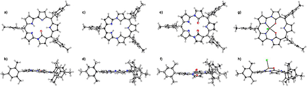 a), b); c), d); e), f); g), h)分别为化合物17,18,19,19Cu的晶体结构(俯视图和侧视图)