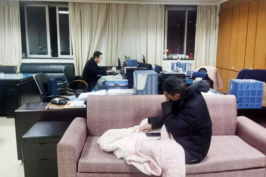 医务部副主任孟飞工作到深夜,累了就在沙发上打个盹