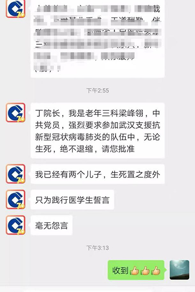 因为正值春节,部分职工已经离开长沙。看到医院的通知,大家纷纷停止休假,取消行程,从四面八方返回医院。除坚守在发热门诊、留观病房、急诊科、感染科等前哨岗位的人员外,先后有1200余名职工递交书面志愿书,其中有医生、护士,也有行政后勤人员。各个科室、部门200多个微信群内,“收到”“就回”“请战”的信息接起长龙,“主任,我申请加入医疗队支援武汉”“院长,我愿意到抗疫一线去”,医院里到处是广大党员、团员和医护工作者坚毅的声音、坚定的身影。