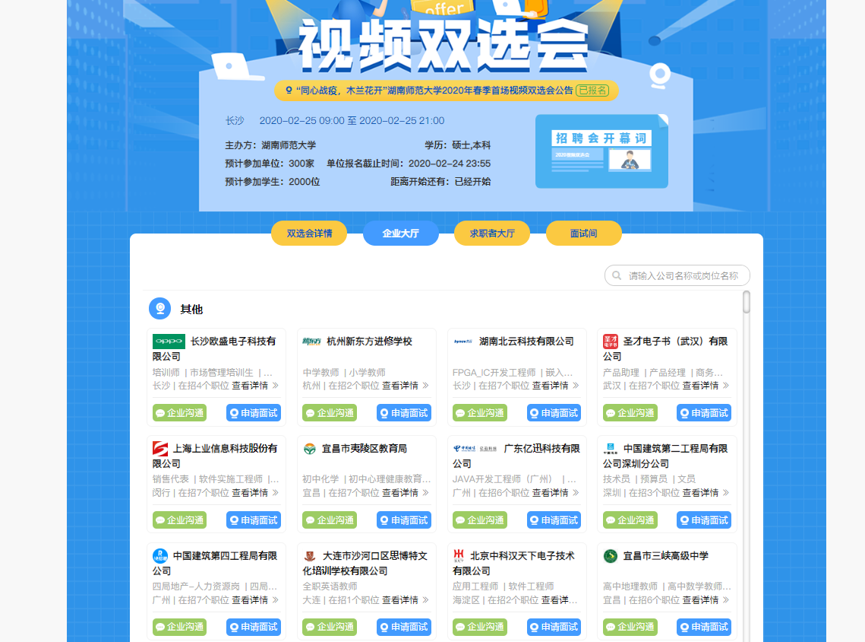 2月25日,招生与就业指导处积极联系各用人单位,利用第三方线上服务平台,科学谋划、创新举措,开展“无接触”招聘活动,通过毕业生云就业平台举办了“同心战疫·木兰花开”春季首场网络视频双选会。线上春招正式拉开帷幕,来自全国各地的240多家用人单位通过报名筛选参与在线视频选才,提供岗位959个,吸引了7300余名学生参与线上求职,网络浏览量达11.54万余次。视频双选会期间,累计简历投递16272次,用人单位主动发起面试邀约2152次,学生求职者主动发起面试申请1705次。