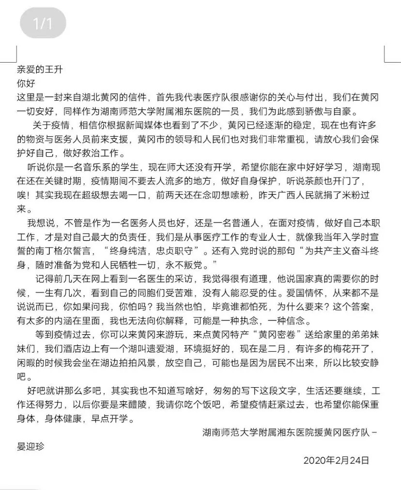 2月24日,一位与王升同龄的前线护士回信感谢王升。信中说:“爱国情怀,从来都不是说说而已,你如果问我,你怕吗?我当然也怕,毕竟谁都怕死,为什么要来?这个答案,有太多内涵在里面,我也无法向你解释,可能是一种执念,一种信念。”诠释了医务工作者救死扶伤的家国大义,传达了与王升共同担当的互勉之情。