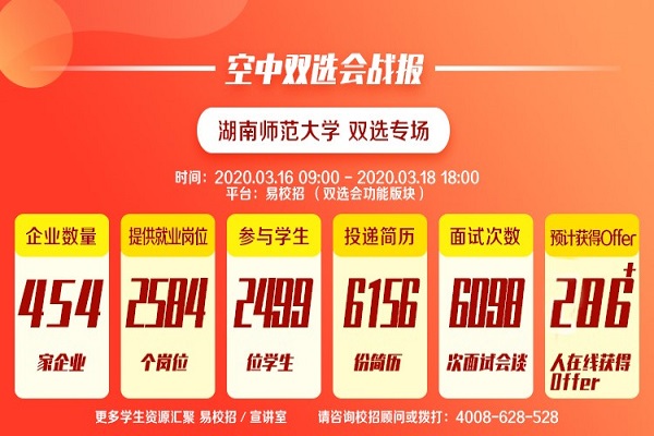 双选会期间,共举办企业专场宣讲会100余场次,用人单位与学生求职者开展视频面试和在线会谈6098次。截止到18日下午晚间,已有286名毕业生与用人单位达成意向工作协议。