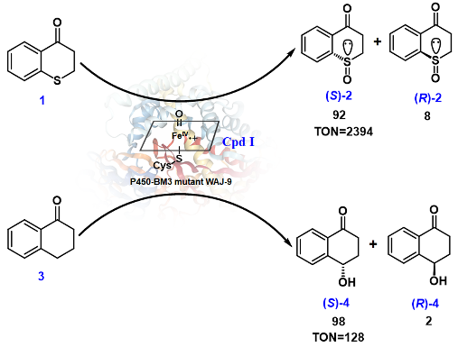 细胞色素P450酶是一类功能强大的氧化酶,其可以立体选择性催化碳氢羟基化,烯烃环氧化,硫氧化等多种反应。由于在其催化循环中会涉及到活性中心血红素的多种氧化状态,这就引发了一个问题,是存在多种活性中间体催化不同反应,还是只有一种通用的活性中间体催化所有的氧化反应?该研究以P450催化不对称硫氧化和碳氢键羟化为模式反应,以刚性底物硫代色满-4-酮和1-四氢萘酮为化学探针,首先通过定向进化的方法,分别获得了具有单一立体选择性以及高活性催化模式反应的突变体,然后通过比较了硫氧化突变体催化羟化反应以及羟化反应突变体催化硫氧化反应的活性和立体选择性,发现其中的差异,由此提出假设存在不同活性中间体催化这两种反应。接着通过以往工作以及过氧化氢酶的实验排除掉两种可能性的中间体,最后通过计算建模的方式确认在这两类反应中唯有血红素-Fe(IV)=O(Cpd Ⅰ)是催化这两类反应的活性中间体。该研究结果进一步阐明了P450催化硫氧化的机理,同时对于P450类蛋白的定向进化改造提供了有效的理论和实际指导。