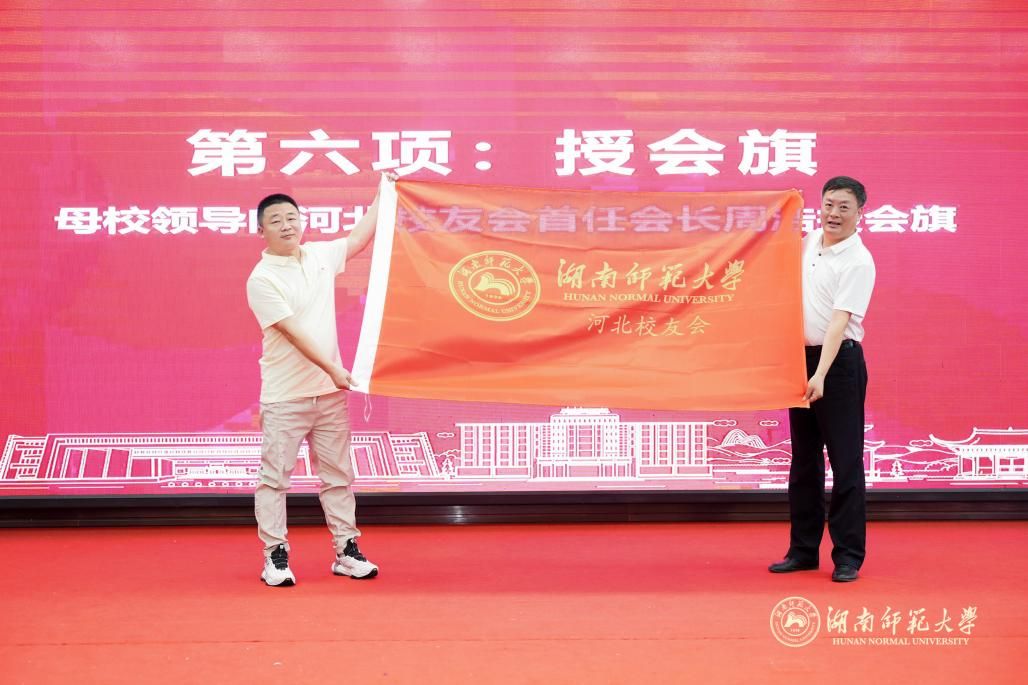 王辉向河北校友会首任会长周浩颁发聘书并授会旗。