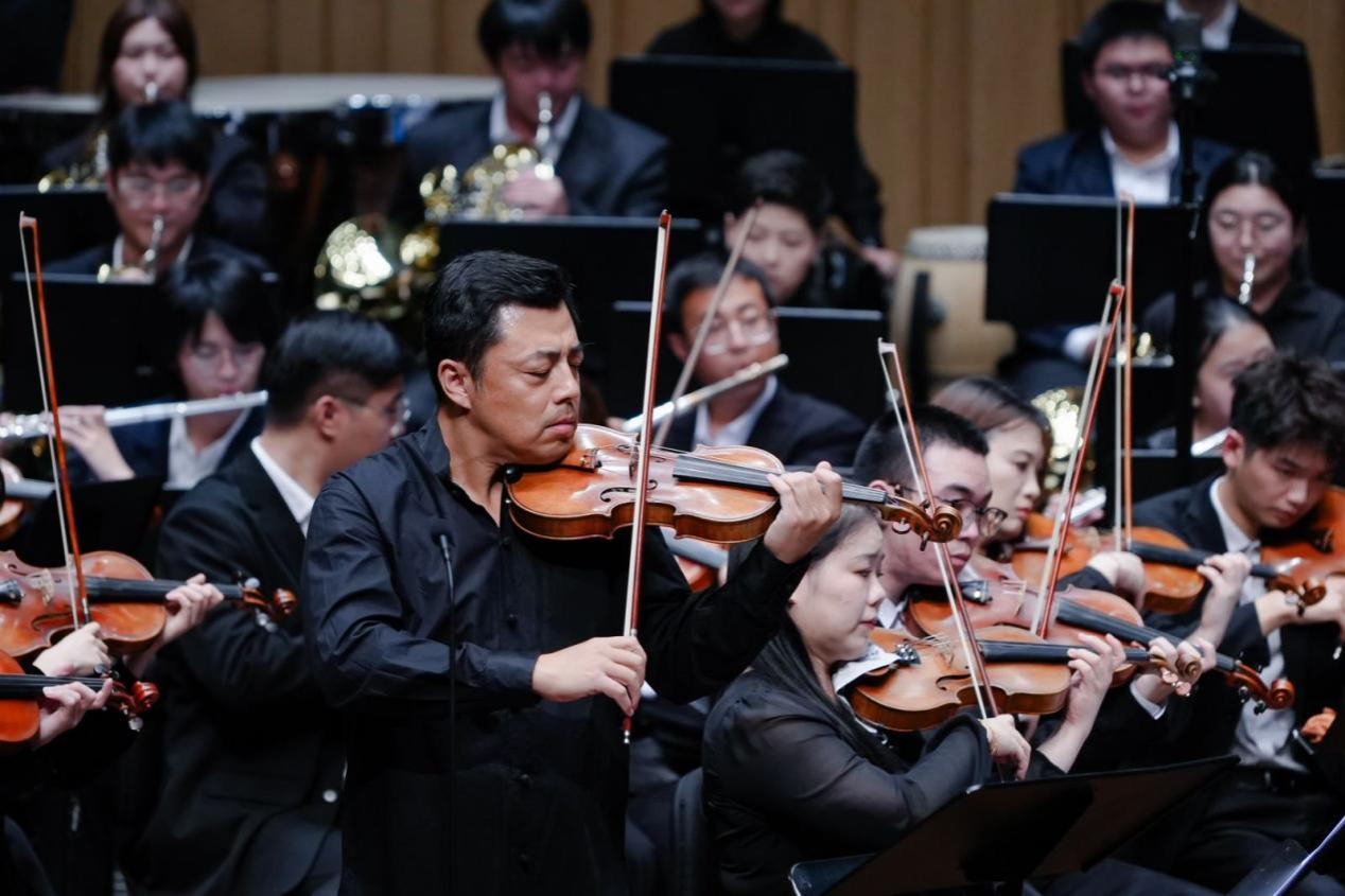 廖勇创作的电影音乐组曲《影•响》展现了中西影视音乐创作的碰撞融合。小提琴演奏家、音乐学院教授柴亮执弓演绎音乐学院名誉院长赵季平创作的《第一小提琴协奏曲》,青年教师、博士生导师们带来了《美丽时光》《红梅随想曲》《花之二重唱》。
