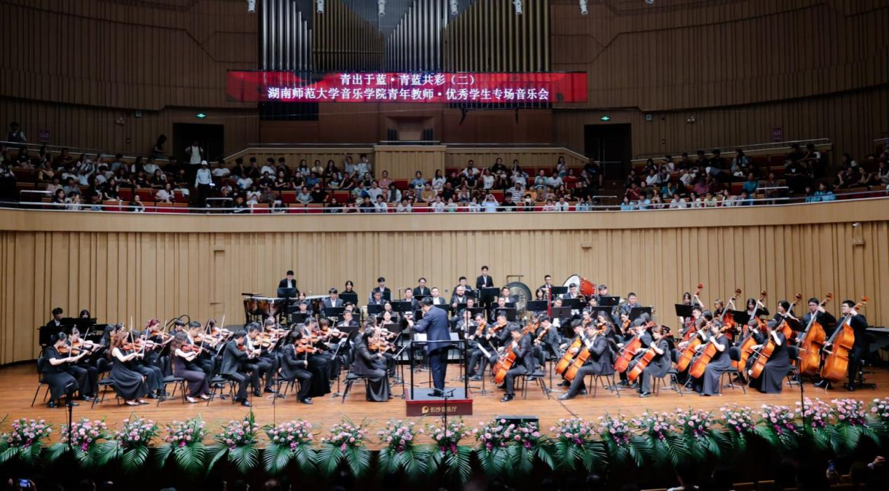 音乐会在潇湘爱乐交响乐团演奏、音乐学院院长廖勇教授创作的管弦乐《花鼓抒怀》中拉开帷幕。