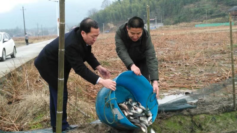 刘起军和关峡苗族乡党委负责同志一起放养了由学校生命科学院省部共建淡水鱼类发育生物学国家重点实验室捐赠的“爱心鱼苗”,并一再叮嘱工作队和乡村负责同志一定要发展好扶贫产业,为插柳村集体经济发展,为插柳村民增产增收做出更多更大贡献。