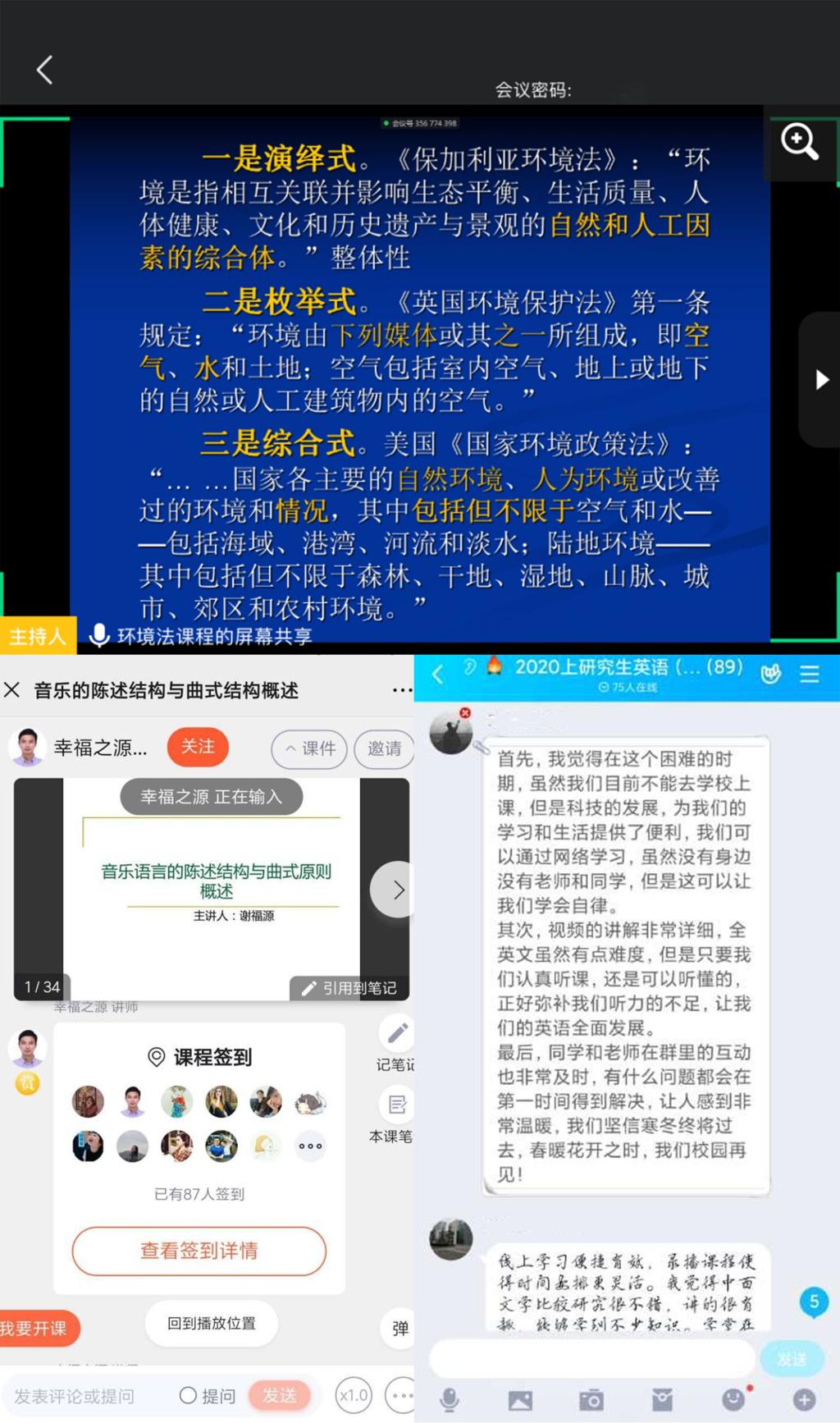 多级联动,确保教学质量。为保证线上教学与线下教学同等质量,发现和及时解决教学过程中存在的问题,挖掘优秀典型教学案例,研究生院制定了“多级联动、多方参与”的教学督导方案。开课前后,学校多次进行教学督导,研究生院及时总结并向校领导汇报进展情况。研究生院制定了《2020年春季学期研究生线上教学检查方案》,成立了由院领导任组长,全院职工参与的检查小组,全员保持在线状态,及时了解各学院教学情况及平台使用情况,指导学院根据平台使用情况及时调整开课平台和上课方式。公共课开课学院勇担重任,为确保公共课教学质量,分别安排了专业教师作为辅讲教师进入班级平台和班级QQ群,实时了解学生上课情况,布置预习和复习资料,答疑解惑,研究生院安排专人全程协助。根据后台管理数据显示,目前公共课开课情况良好,视频播放流畅,学生对公共课线上教学的总体评价都非常高。各学院提前制定了具体的教学实施方案,成立了线上教学督导小组,指导、协调、检查、督导本院课程线上教学,及时收集和反馈线上教学效果。在全民抗“疫”关键时刻,任课教师充分发挥主观能动性,创新教学模式,确保教学效果,很受学生欢迎。个别学生因网络原因无法参加直播课程学习的,教师均单独联系学生,指导学生采用其他方式开展课程学习。很多教师和研究生在班级群、朋友圈也交流、分享了精彩瞬间。